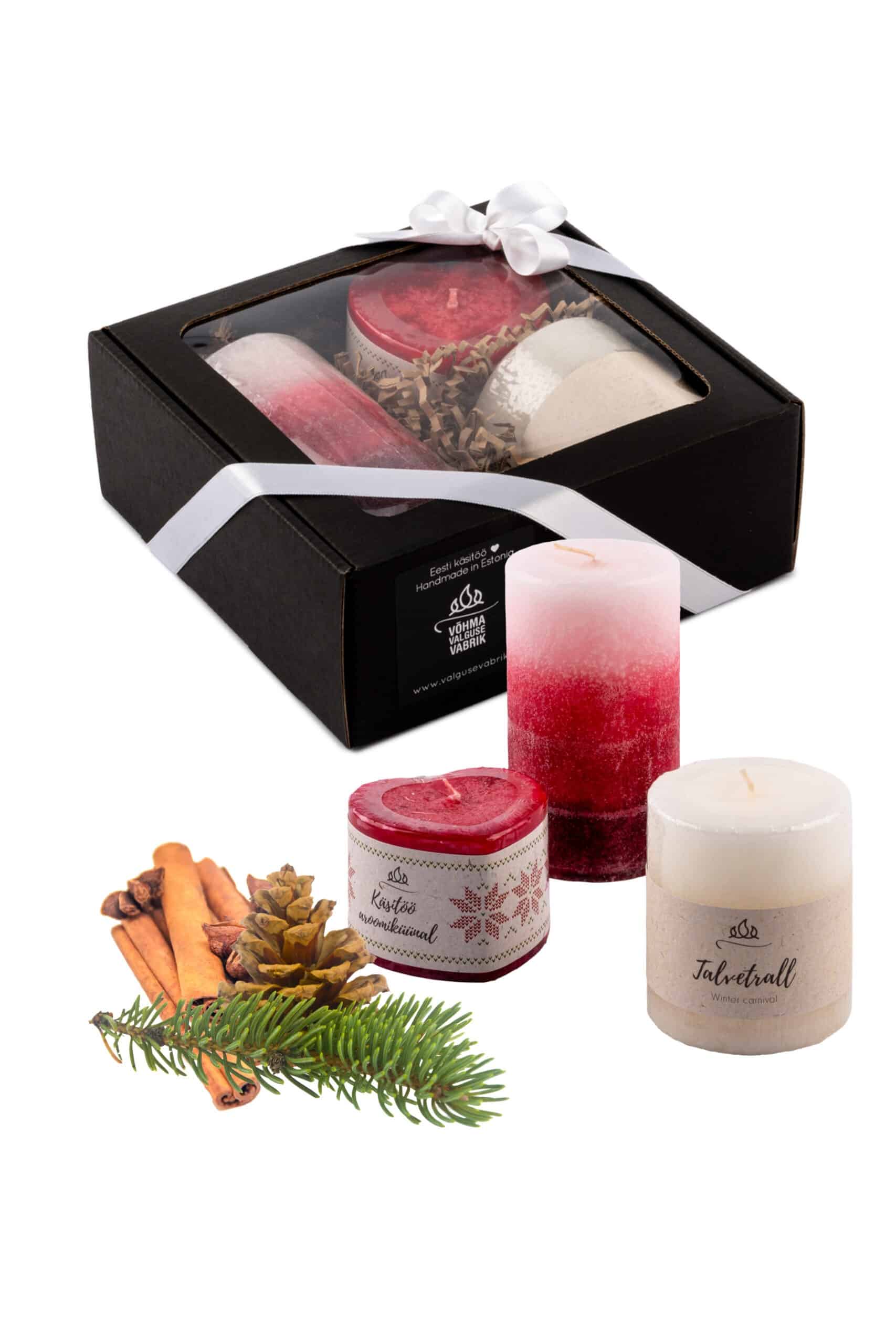 Sellesse komplekti oleme kokku pannud rõõmsa valiku käsitööna valminud lõhnaküünlaid, mis täidavad toa just pühadeaega sobivate aroomidega. Küünlad on pakendatud musta värvi elegantsesse aknaga kinkekarpi, millele on ümber seotud värviline lipsuga pael.