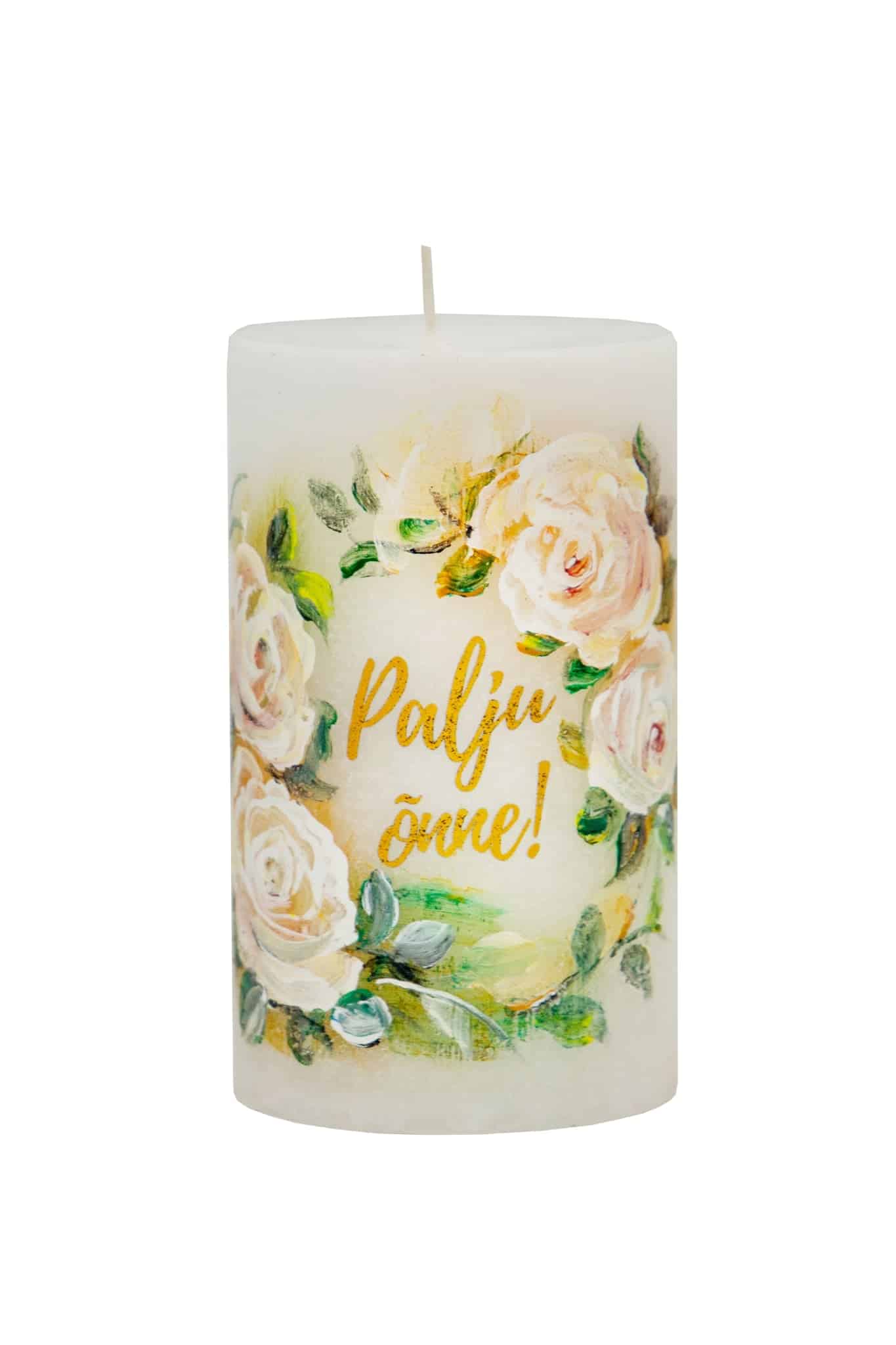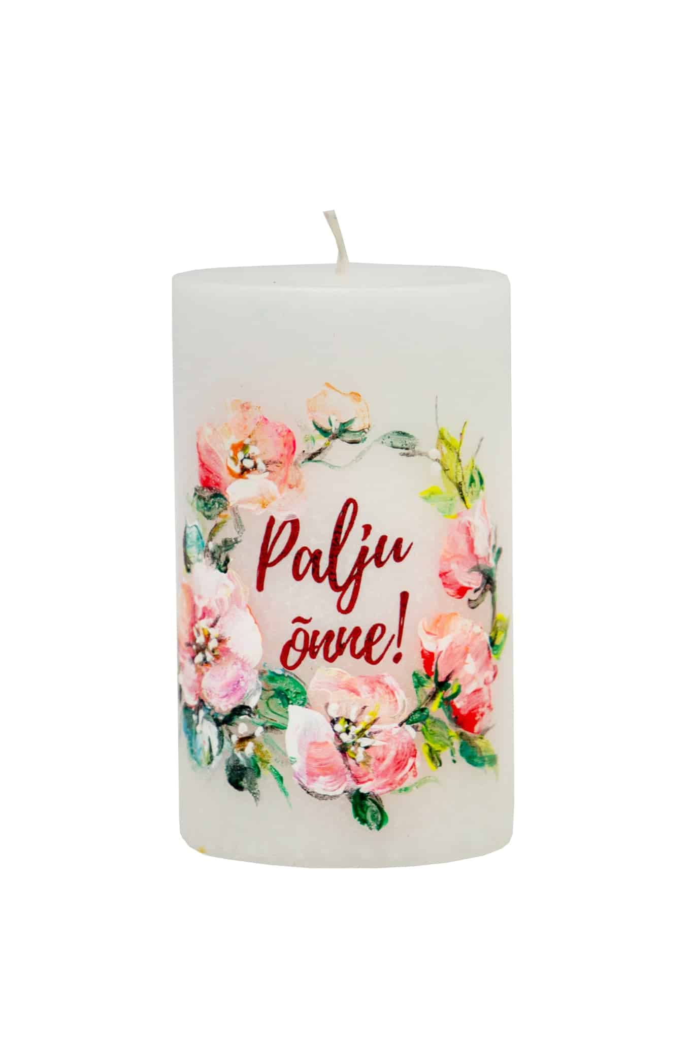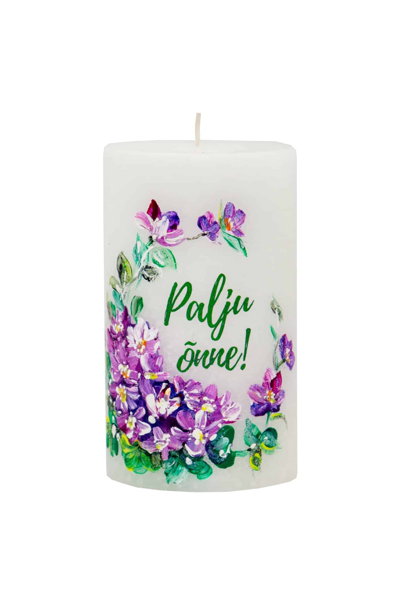 Käsitsi maalitud “Palju õnne!” tekstiga lauaküünal 7 x 12cm, 60h ilma lõhnata– 1tk, pakitud tsellofaani