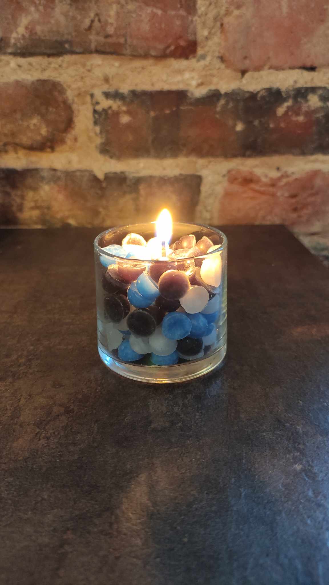 Komplektis leiad: sinimustvalged vahamummud, puhas rafineeritud parafiin, plekist alusega taht/tahid, küünla klaas/klaasid