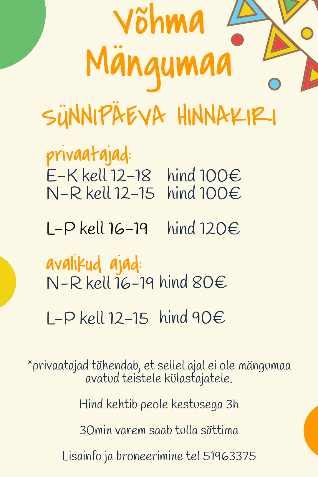 Pakume võimalust broneerida mängumaa sünnipäeva või mõne muu toreda tähtpäeva pidamiseks.